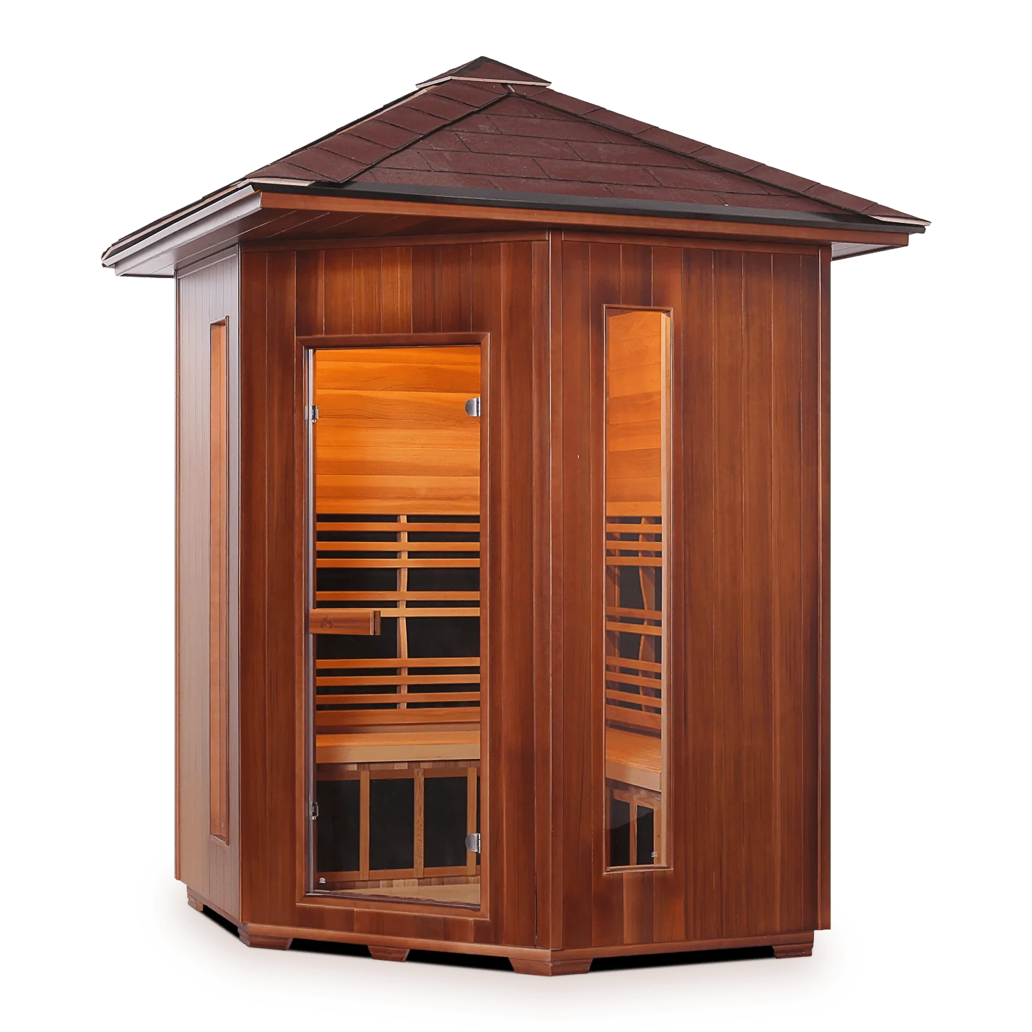 Got a space? Ah, the fun part of considering your options when choosing your sauna. This 4 Person Corner Rustic Canadian Cedar Outdoor Sauna is exceptional in its effectiveness and space efficiency. This sauna will fit perfectly in any corner of your outdoor space or home. Enjoy the space and the health benefits in style and comfort this sauna offers. There truly isn't a better way of space-saving, than choosing this sauna style. Enlighten Sauna's personal favorite sauna is ideal in smaller homes, offices, vacation homes, or anywhere where even the smallest amount of area must be used. Why not consider 4 Rustic Corner Infrared Sauna? It's a space-efficient solution and one that looks quite beautiful. Don't you think?.